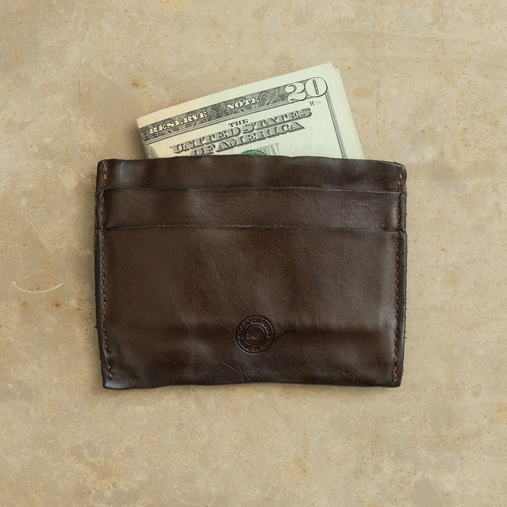 This Campomaggi Italian leather card holder in a rich, dark Brown is crafted from garment-dyed natural cowhide for a rich, lived-in patina that only gets better with age. Compact yet practical, it features five card slots to keep your essentials organized without bulk.