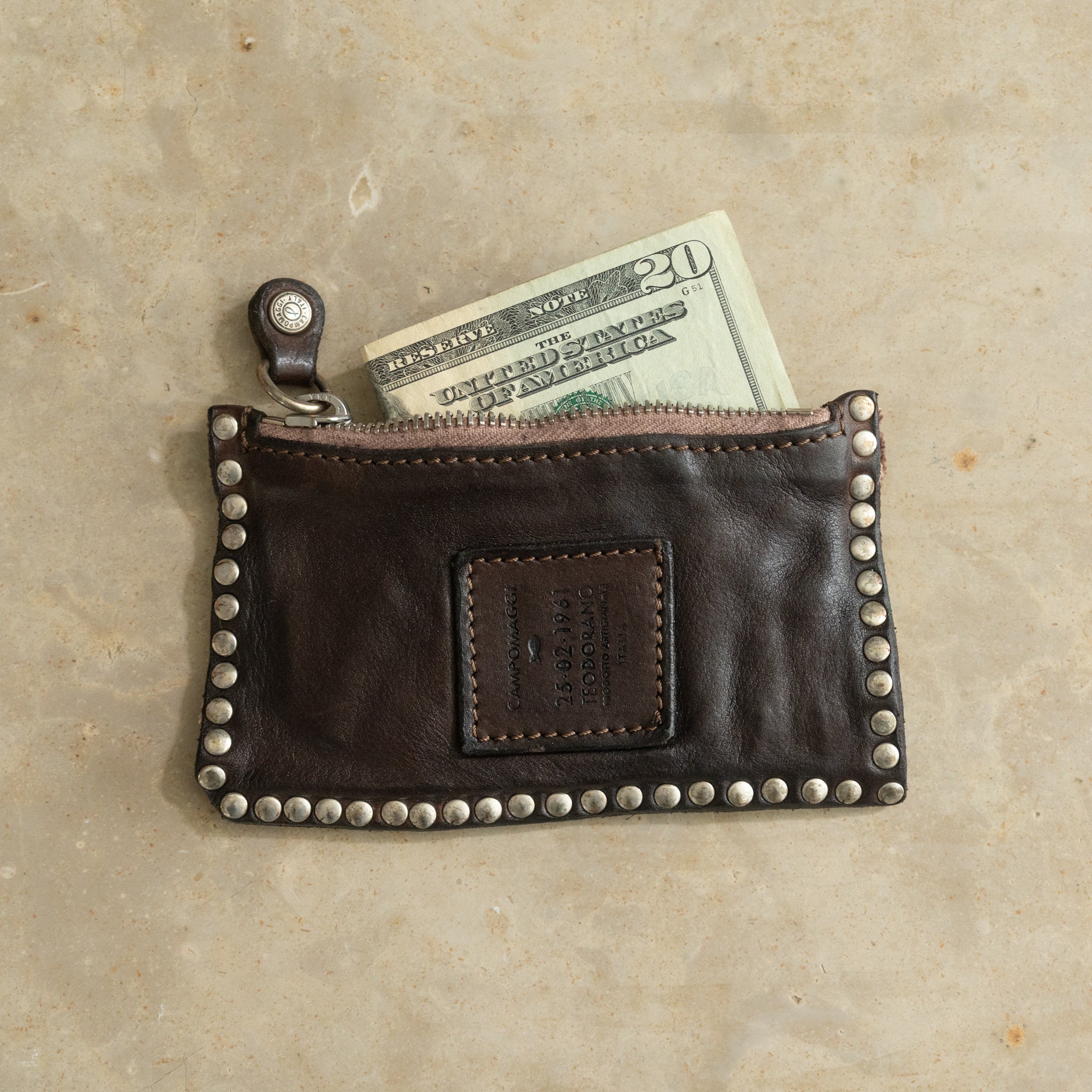 This Campomaggi Studded Italian leather card holder with zipper in Black is crafted from garment-dyed natural cowhide for a rich, lived-in patina that only gets better with age. Compact yet practical, it features 10 card slots to keep your essentials organized without bulk plus a zipper pocket for coins or cash.