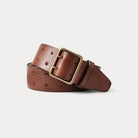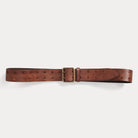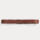Made in Italy from rich vegetable-tanned leather, this belt is hand-dyed and burnished for depth and character that will only improve with age. A custom double-prong solid brass buckle, left unlacquered to develop a natural patina, adds a rugged, timeless touch. Finished with a single leather keeper, corroded brass snaps at the interior, and a slightly pointed tip. 1½" wide.