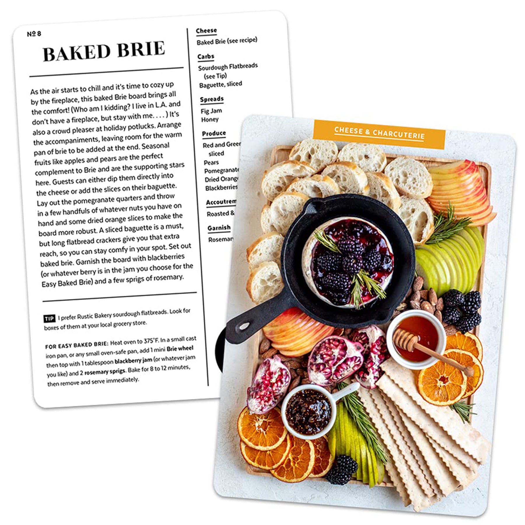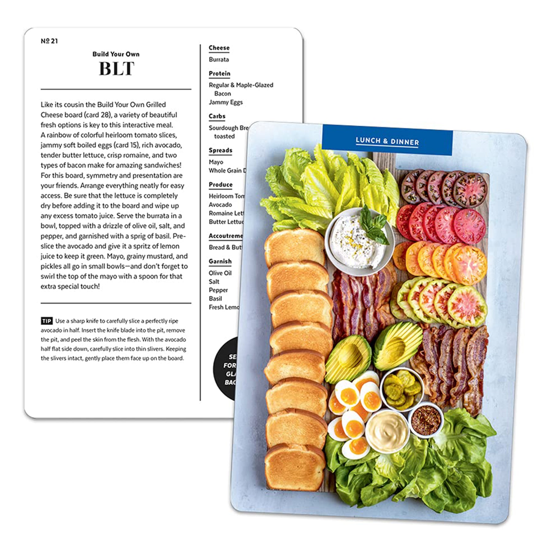 Each card features a crave-worthy photo on the front and step-by-step instructions on the back, including ingredient lists, clever swaps, and simple ways to upgrade store-bought staples. Think breakfast boards, dessert trays, budget-friendly bites, and showstoppers like a Build-Your-Own Hot Dog spread or a vibrant vegan platter.