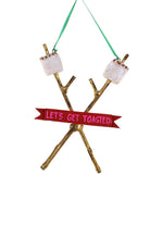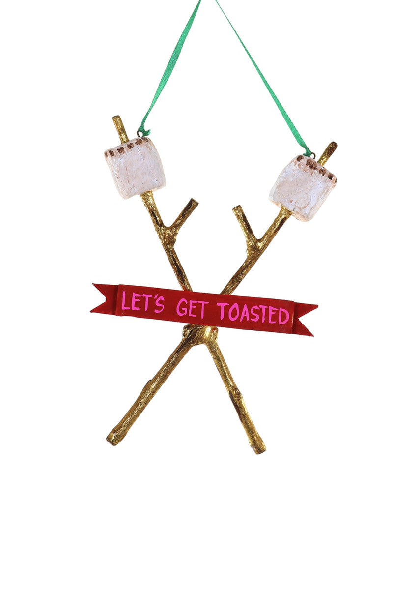 Add a dose of campfire humor to your tree with the “Let’s Get Toasted” ornament. Featuring two marshmallow-tipped roasting sticks joined by a playful little sign, it brings cozy, golden-hour vibes and a cheeky wink to your holiday décor.