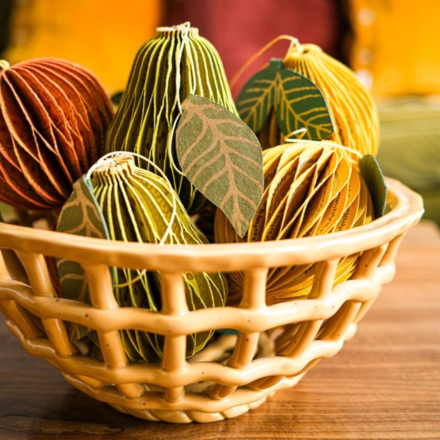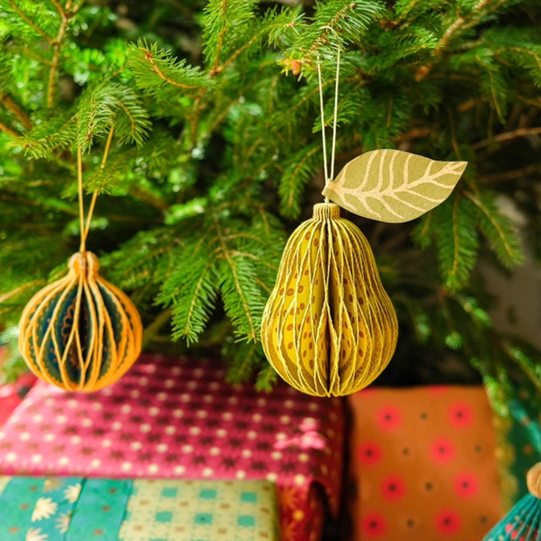Crafted from layered recycled cotton paper, this beautifully detailed ornament unfolds into a three-dimensional honeycomb pear. Finished with a cotton hanging loop and secured with hidden magnets, it opens with ease and stores flat between seasons.