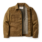 Built for hard work and harsh conditions, this Short Lined Cruiser Jacket is crafted from Filson’s legendary 14-oz. oil-finish Tin Cloth—a tightly woven, waxed cotton that stands up to weather, abrasion, and tough use. Over time, it molds to your movements like a trusted pair of heavy-duty jeans. The hip-length cut offers easy access to pockets and tools without riding up, while a lightweight canvas body lining and smooth polyester-lined sleeves make layering a breeze. Details like metal shank buttons, bar-tacked hand pockets, and adjustable hem tabs add to its durability. With utility-focused chest pockets and a water-resistant finish, it’s a reliable layer for work or field. If you’re between sizes or layering up, consider sizing up.