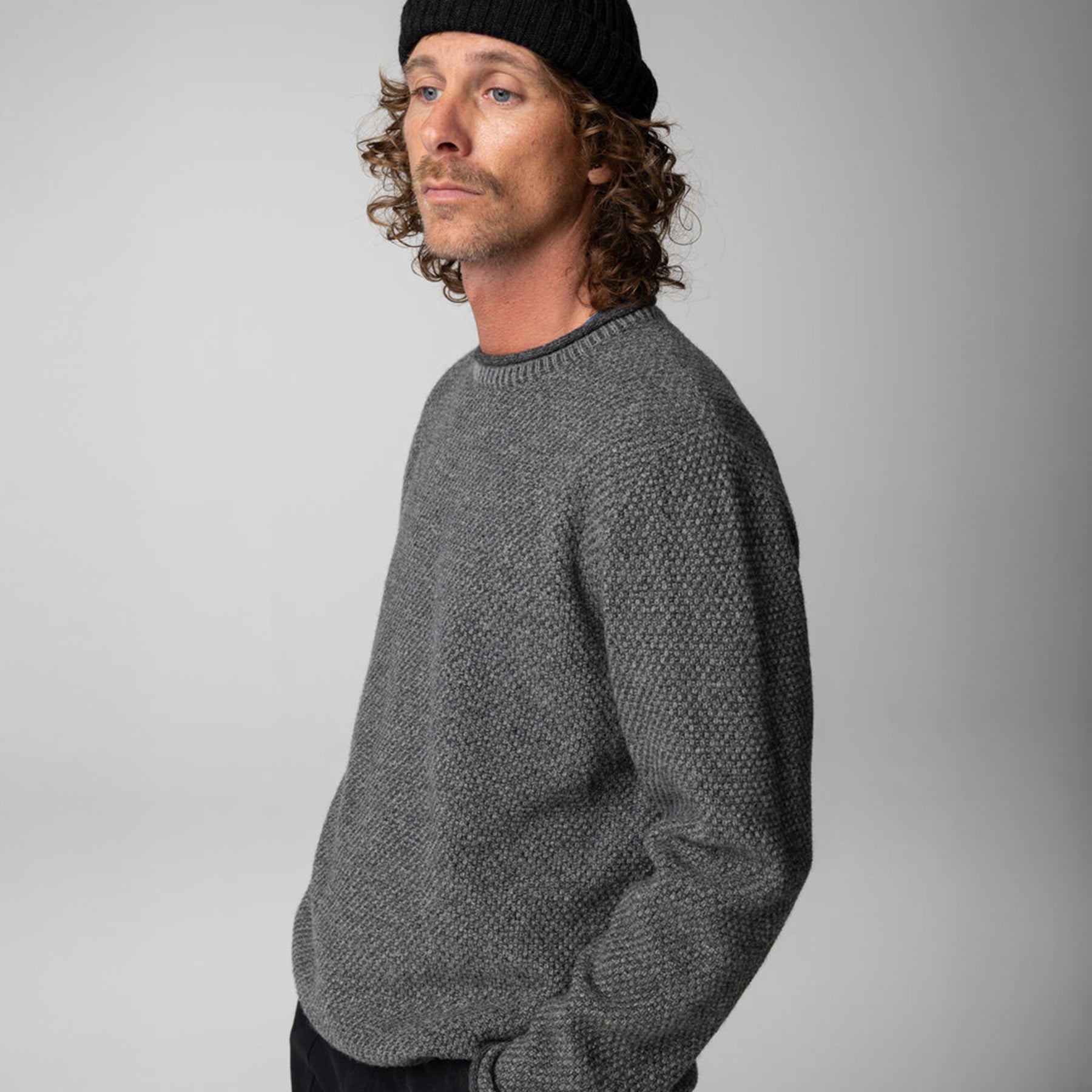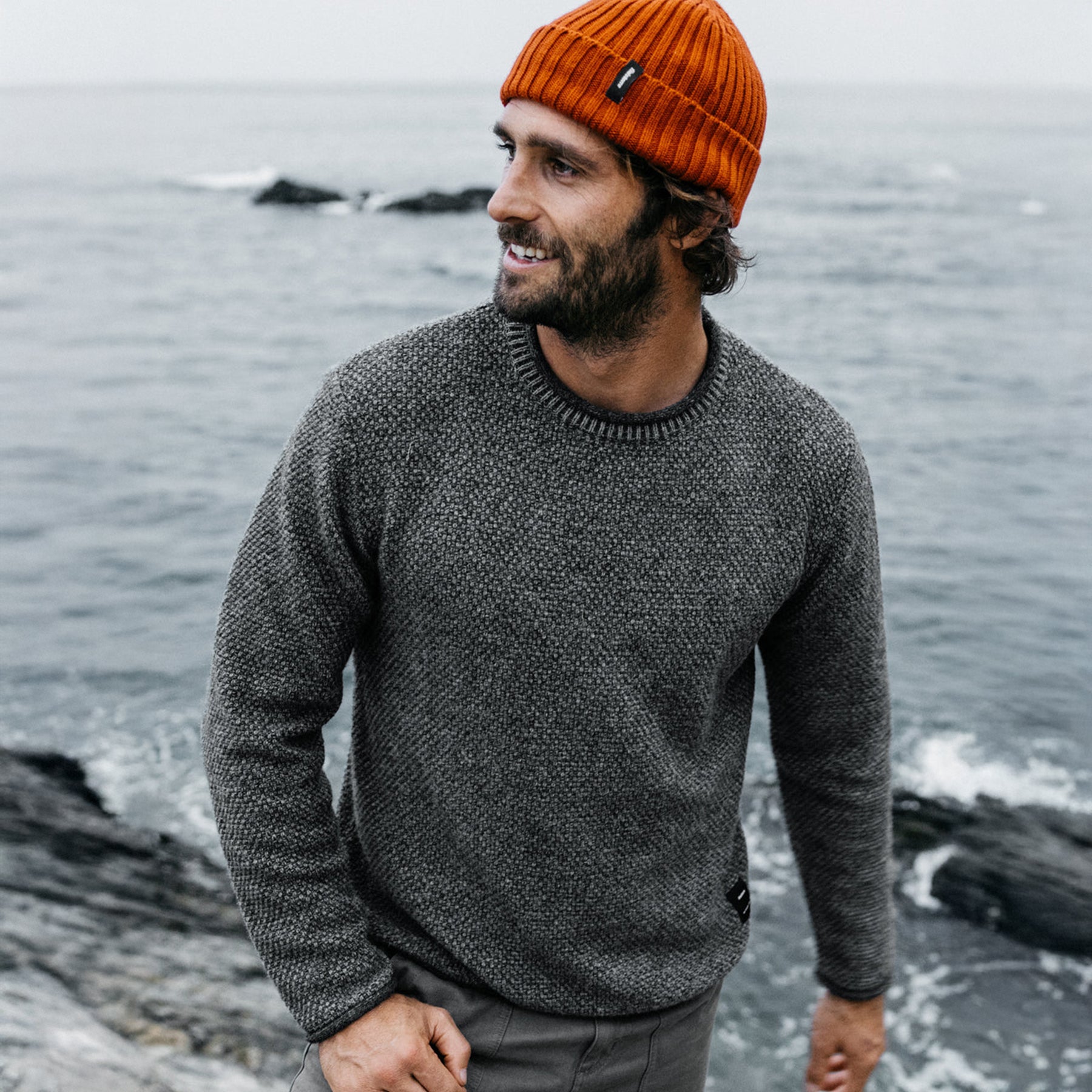 A community favorite, it’s crafted from a soft blend of 80% wool and recycled nylon—warm, durable, and structured enough to hold its shape through years of wear. The all-over textured fisherman’s stitch delivers that classic, rugged look while staying slim enough to layer comfortably under a jacket.